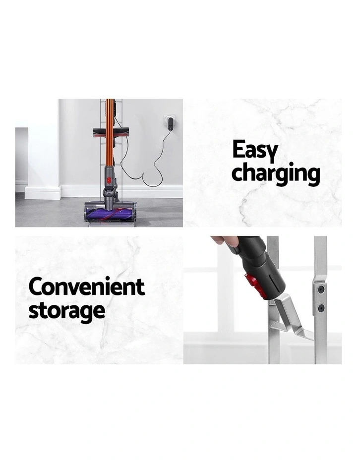 Keep your pristine walls free of holes with our Dyson-compatible Handstick Vacuum Stand. The stand is freestanding meaning there is absolutely no drilling of walls required and allows for portability so that it is no longer tied to one location and can easily move the stand from room to room or house to house. With its compact and space-saving design, the stand can fit perfectly into all the tight nooks and crannies. And you will no longer have to stop in the middle of cleaning to go searching through your whole house for vacuum attachments, because the stand has convenient storage for all your attachments to prevent them from getting lost or cluttering up your house. Our stand is compatible with Dyson and other handstick vacuum cleaners up to 11cm in width and you can rest assured that your expensive Dyson is in safe hands. Other stands can be unstable and flimsy due to poor quality material and loose fixings. Our stand on the other hand is made to stand up to robust use with its strong anti-corrosive metal frame, reliable fixings and stable base. Assembly is easy and all the required parts come included.