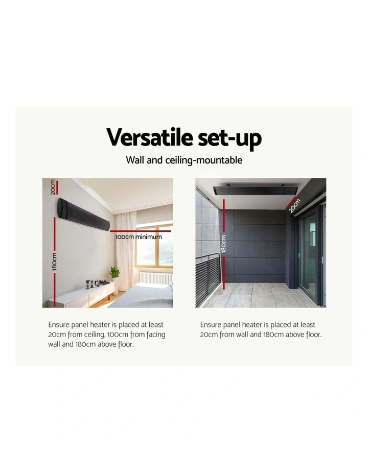 With its sleek and slimline profile, the Devanti Radiant Panel Heater is absolutely stylish from any angle. But more than just good looking, the panel heater is a perfect infrared heater that provides all the benefits of natural sun-lit warmth. Comprising a black anodized aluminium body and efficient non-glowing heating element, the panel heater ensures even heat dispersion all round. It can be wall or ceiling mounted with the included mounting accessories and also suitable for both indoor and outdoor use with its water-resistant and corrosion-resistant properties. Better still, the brackets are adjustable for flexibility. A handy remote control also makes for easy operation of the heater from any location within range. Not least, the panel heater works ever so silently and comes with a safety overheat protection. It also complies with Australian standards and is approved for use with SAA, CE, EMC and RoHS certification.