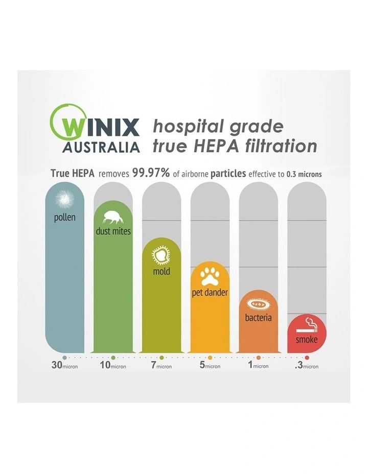 - Australian Hospital-grade True HEPA filter – captures 99.97% of airborne pollutants as small as 0.3 microns